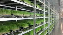 Systems have been developed recently that allow for many tons of sprouts to be produced each day, year round. Sprouted grains can significantly increase the nutritional value of the grain compared with feeding the ungerminated grain to stock.[12] In addition, they use less water than traditional forage, making them ideal for drought conditions. Sprouted barley and other cereal grains can be grown hydroponically in a carefully-controlled environment.[13] Hydroponically-grown sprouted fodder at 150 mm tall with a 50 mm root mat is at its peak for animal feed.