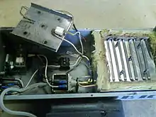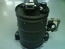 Heated fog machines use either an inert gas or an electric pump to propel mineral oil, propylene glycol, or glycerin and water mixture into a heat exchanger, where the solution is vaporized. The most commonly encountered form of heated fog machine is the pump machine. Very basic models of this type of machine consist of a fluid reservoir, an electric pump to move the fog fluid and heat exchanger which vaporizes the fluid. More complex models may include a variety of other features, including variable speed pumps to control the output of fog, timer modules, or components for remote operation and monitoring of the fog machines' status. Some manufacturers have produced accessories and fluids that when combined with an ordinary heated pump machine, create fog effects similar to chilled fog machines. Gas propelled fog machines use an inert gas (most commonly CO2 or nitrogen) to propel either mineral oil or a glycol based fluid into a heat exchanger where it is vaporized into particles, creating a fog. Some models of gas propelled fog machine provide control over the output of fog by varying the volume of gas used to propel the fluid.