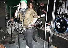 The supporting acts on the tour were Cobra Starship, All Time Low, Metro Station, and Hey Monday. For five dates on the tour, Fall Out Boy brought along rapper 50 Cent. Wentz explained, "We've been fans of [him] since we heard 'Wanksta' in 8 Mile. We've wanted to do something with him for awhile [sic], and having him out on the tour is gonna take the show to a whole new level. It's exciting to bring two different genres together and give the fans a new experience".[89] The rapper had similar feelings about the situation: "This will be a major moment in music history. Joining forces with Fall Out Boy, one of the most dynamic rock bands in the industry, will be an exciting and historic event for rock and hip-hop."[89] Due to the conflicting fan opinion regarding the album, concertgoers would "boo the band for performing numbers from the record in concert", leaving Stump to describe touring in support of Folie as like "being the last act at the vaudeville show: We were rotten vegetable targets in Clandestine hoods."[90] "Some of us were miserable onstage," said Trohman. "Others were just drunk."[91]