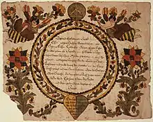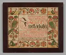 Fraktur art was a decorative element for documents such as poems, religious texts, particularly birth and baptismal certificates, and furniture.[11] Artists typically used a goose quill as a primary tool to outline and draw onto their mediums while using a brush made from cat hair to put the colours down.[4] Fraktur art is closely related to calligraphy, not only in the similar use of tools but also in the dependence on the line to create dimension and shape within the artworks.[11] All the elements within the artwork are outlined with a black calligraphic line to enhance the dimensionality of the element by providing layered details onto the flat colours laid down, while also contrasting it against the often pale background and monochromatic text.[4] However, the lack of expressive brushwork, texture and shading resulted in an overall flatness by enhancing the two dimensionality of the artworks. The main subject matter of these fraktur artworks often consisted of birds, animals and flower motifs within a floral arrangement that encircled the text as a border.[13]