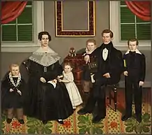 The style of American folk art varied across different regions due to the diversity of immigrants.[4] However, there is some influence of academic conventions in the composition, setting and poses of the portraits.[9] There were two types of settings for portraits: a solid, monotone backdrop or the homes of the sitters often surrounded by objects that conveyed their personality, status or gender.[10] The portraits are restrained in all aspects as they are characterised by a flattened perspective with generalised lighting which created little to none tonal shading.[9] As artists distorted scale and depth, they confined their sitters to a narrow dimension of space between the picture plane and the background behind them to allow for a shorter depth of field.[10] There is an overall flatness and linearity to the paintings due to the flat, delicate application of paint across the entire artwork. The artworks are carefully composed with clear spatial arrangements for each figure within the work as the sitters are either posted in full profile, looking straight at the viewer or slightly turned to one side.[11] Folk art portraits were either bust portraits from the chest upwards or full body portraits with static poses as artists often relied on compositional formulas for the face and hands which provided a resemblance to all the sitters which allowed artists to work quickly with limited materials and time.[10] This resulted in the lack of emotion depicted through the stern expressions, direct gazes and tight pursed lips.[12] Motifs and objects were used instead as an identifying mark for the patrons with books and eventually newspapers were a common traditional motif in male portraits, while female portraits contained symbols of femininity and domesticity such as fruits, flowers, animals or handheld fans.[10] The texture and patterns of the sitters' clothes, furniture or carpets allowed artists to enliven the already sombre portraits and evoke the personality of the sitters.[12]