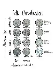 Folk's carbonate rock classification details the relative proportions of allochems in the rock and the type of matrix. The classification scheme covers most common carbonate rocks, however the more inclusive although less precise alternative, Dunham classification, may be preferred in some instances. Folk classification consists of one or two prefixes followed by a suffix.[1]