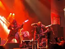 The large number of instruments that some bands rely on in recording their studio albums can be a hindrance for live performances. While Orphaned Land are able to perform onstage with twenty musicians in their homeland of Israel, they have to rely on a computer to replicate the roles of the guest musicians for concerts elsewhere.[140] Some folk metal acts confine themselves to studio recordings and are not known to perform any live concerts. This includes Folkearth,[105] and Falkenbach.[141] Other folk metal bands expand their regular roster to include more musicians and consequently, it is not uncommon to find bands in the genre featuring six or more members in their line-up. Some of the sextets in the genre are Schandmaul,[17] Cruachan,[18] Korpiklaani,[62] Turisas,[142] and Midnattsol,[109] while septets include Ithilien, Subway to Sally,[13] In Extremo,[16] and Lumsk.[83] Both Silent Stream of Godless Elegy[52] and Eluveitie[103] boast eight members each while the line up of Mägo de Oz totals nine performers.[49] Even when a band includes members dedicated to folk instruments, they might still rely on guest musicians to further enhance their sound. As an example, Lumsk added thirteen guest musicians to the band's seven members on their debut album Åsmund Frægdegjevar.[143] At times, guest musicians are known to become full-fledged members of the band, as was the case in Skyforger[139] and Turisas.[76]