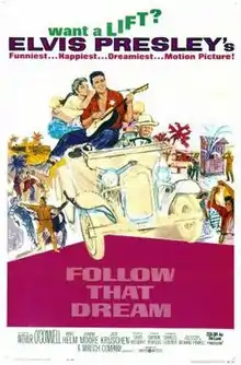 Follow That Dream is a 1962 American musical film made by Mirisch Productions and starring Elvis Presley. The film was based on the 1959 novel Pioneer, Go Home! by Richard P. Powell. Producer Walter Mirisch liked the film's song "Follow That Dream" and retitled the picture accordingly.[2] The film reached #5 on the Variety weekly Box Office Survey, staying on the chart for three weeks, and finishing at #33 on the year-end list of the top-grossing movies of 1962.