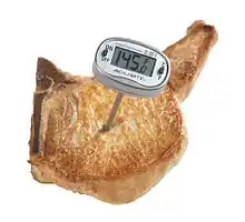 A meat thermometer or cooking thermometer is a thermometer used to measure the internal temperature of meat, especially roasts and steaks, and other cooked foods. The degree of "doneness" of meat or bread correlates closely with the internal temperature, so that a thermometer reading indicates when it is cooked as desired. When cooking, food should always be cooked so that the interior reaches a temperature sufficient, that in the case of meat is enough to kill pathogens that may cause foodborne illness or, in the case of bread, that is done baking;[1] the thermometer helps to ensure this.