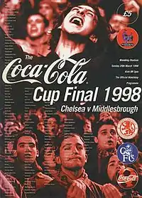 The 1998 Football League Cup Final was a football match played between Chelsea and Middlesbrough on 29 March 1998 at Wembley Stadium. Chelsea, under new manager Gianluca Vialli, won with two extra time goals and won the UEFA Cup Winners' Cup later that season. Middlesbrough's second consecutive defeat in the final was followed by promotion back to the Premier League after just one season.