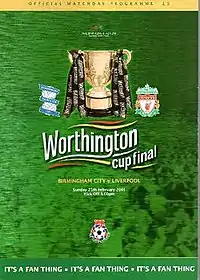 The 2001 Football League Cup Final was a football match played between Birmingham City and Liverpool on 25 February 2001 at the Millennium Stadium, Cardiff. It was the final match of the 2000–01 Football League Cup, the 41st season of the Football League Cup, a football competition for the 92 teams in the Premier League and the English Football League. Liverpool were appearing in their eighth final; they had previously won six and lost two, while Birmingham were there for the second time. During their last appearance, they had previously beaten local rivals Aston Villa in the 1963 final.