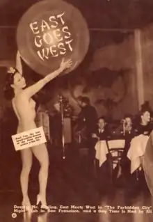 Noel Toy, the "Chinese Sally Rand", performed a burlesque fan dance and bubble dance[30] which started the golden age of Forbidden City.[9] She was born in San Francisco, but raised in the small town of Inverness in Marin County. Growing up, Toy recalls herself as the only Chinese person and only having Caucasian friends. After attending Marin Junior College, she received a scholarship from University of California at Berkeley. She first started as a nude model at the Golden Gate International Exposition due to financial needs. That's where she met Charlie Low, who offered her a salary of 50 dollars per week to perform at Forbidden City, instead of the 35 dollars that Toy was making at the World's Fair.