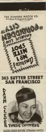 While Forbidden City was the most famous Chinatown nightclub, it competed with other local venues that featured Asian American performers, such as Club Shanghai, Lion's Den, Kublai Khan, Dragon's Lair, and Chinese Sky Room.[1] In fact, Charlie Low had a rivalry with Fong Wan, a famed herbalist and the owner of Club Shanghai. In 1949, Fong Won sued Low for $50,000 for "stealing" an acrobat from his club. The lawsuit was covered by the San Francisco Chronicle.[3]