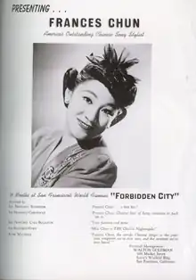 Frances Quan Chun was a singer billed as the "Chinese Frances Langford" .[27] According to her interview in the book Forbidden City, USA, she stated that it was a "novelty" at the time to work at the Forbidden City as a singer in the 30's regardless of its scandalous reputation. Born and raised in a musical family in Hawaii, her father loved playing instruments such as ukulele and guitar. She eventually landed in San Francisco during the Depression era. She participated in Cathayans (a band) in the early 1930s, where she was 16. Then, she joined Forbidden City in her 20's. [4]