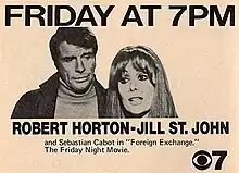 Foreign Exchange is a 1970 American action thriller drama spy television film originally aired on ABC and directed by Roy Ward Baker.[1] Its teleplay, written by Jimmy Sangster, was based on his own 1968 novel of the same name.[2] The film starred Robert Horton, Jill St. John, and Sebastian Cabot.[3] It is a sequel to the television film The Spy Killer, which was released the previous year.[4]