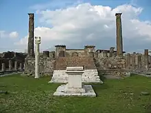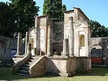 Isis was one of the central goddesses in ancient Egyptian religion and mythology.[30] Evidence supporting the presence of the cult of Isis can be found in Puteoli, another Campanian city, as early as the beginning of the second century BCE.[31] The Temple of Isis in Pompeii, which can also be traced back to the second century BCE, marks the rise of her cult.[31] The cult became popular among slaves, freedmen, women and later the nobility with followers believing that Isis could grant eternal life as she resurrected her slain husband (Osiris) from the dead. Its foreignness to Romans and association with Cleopatra, especially during the transition from the Second Triumvirate to the reign of Augustus, sparked some contradictory actions by the Roman government. Leading up to and following the Battle of Actium, Augustus engaged in an ideological campaign which labeled Mark Antony as an effeminate other, made less manly and less Roman by his relationship with Cleopatra.[32] Augustus's subsequent restoration of shrines to Isis signified that she could perhaps be welcomed into Roman religion even after her association with Cleopatra.[33] However, his restriction of the worship of Isis to outside the pomerium in 28 BCE rendered the goddess definitively non-Roman, and demonstrated how uneasy the Roman governing elite were to envelop Egypt into the Roman sphere and risk a loss of identity.[33] Regardless, the Romans needed Egyptian imports for survival, and had little choice but to syncretize deities like Osiris and Isis into their world. In Pompeii, this Romanization of Egyptian deities (Interpretatio Romana) can be seen in depictions of Isis-Venus, Isis-Fortuna, and even Isis-Ceres in frescos, gardens, and small objects throughout the city.[32]