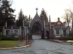 Forest Hill Cemetery is a rural cemetery in Utica, New York founded in 1850. The cemetery was listed on the National Register of Historic Places in 2017. Forest Hills Cemetery is located at 2201 Oneida Street, in Utica, New York. It is a non-sectarian cemetery, which means anyone of any religion can be buried there. Over the years some nationally and locally recognized people have been buried here. Because of its many monuments, grave sites of famous people, along with other historical structures, the cemetery is sometimes referred to as "Utica's outdoor museum". The cemetery owns 165 acres and currently 95 acres are developed and in use.