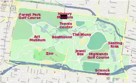 Forest Park is home to five of the region's major institutions: the St. Louis Art Museum, the St. Louis Zoo, the St. Louis Science Center, the Missouri History Museum, and the Muny amphitheater.[42] It has several recreational facilities, including the Dwight Davis Tennis Center, the Steinberg Skating Rink, the Boathouse Restaurant (with boat rentals), the Forest Park Golf Course, the Highlands Golf and Tennis Center, handball courts, and fields for softball, baseball, soccer, cricket, rugby, and archery. The park also features over 30 miles of walking and bicycling paths.[2]