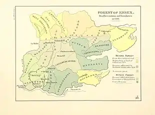 The Forest of Essex covered nearly all of the traditional extent of Essex, but that is not to say the majority of Essex was wooded. The naturalist Oliver Rackham carried out an analysis of Domesday returns for Essex and was able to estimate the county was 20% wooded in 1086.[1] The area covered by Forest Law excluded the least wooded areas of the county along the Thames and North Sea coasts so the percentage for the Forest of Essex was a little higher.