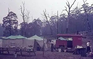 Although revenue from timber sales declined during the Great Depression the Government channelled substantial funds to the Commission for unemployment relief works which were well suited to unskilled manual labour such as firebreak slashing, silvicultural thinning, weed spraying and rabbit control. By 1935–36 the Commission employed almost 9,000 men in relief works and a further 1,200 boys under a "Youth for Conservation Plan".[15] One success story was at "Boys Camp Archived 9 August 2018 at the Wayback Machine" near Noojee which was made possible with the support of two prominent Melbourne businessmen and philanthropists, Herbert Robinson Brooks and George Richard Nicholas[61] together with the Chairman of the Forests Commission Alfred Vernon Galbraith.[62]