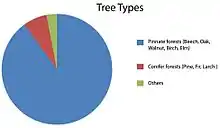 Almost half of Kosovo's entire territory is a forested area, thus leading to a satisfying extent of annual forest growth. The 40 million m3 of wood is annually increased by about 1.3 million m3, or about 3 m3 per hectare. On the other hand, the annual national demand for wood is believed to be approximately 1 million m3.[19] This enormous demand is due to firewood being the most common heating source throughout the entire country. The Kosovar forest are thus enlarged by 300,000 m3 of wood each year, whereas the global forests are in decline.[20]