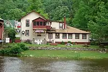 ![]() Forksville Covered Bridge, built 1850, over Loyalsock Creek with the Forksville General Store behind | |