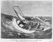 On 4 May they purchased for £61 15s (an outrageous price at the time) one of the boats from the barque Bengal, which was at Adam Bay 21 April to 8 May. She was an open boat, like a whaleboat, built in Sweden,[4] 23.5 by 6 feet (7.2 by 1.8 m), with two masts, spritsails, to which the venturers added a jib. They also added lockers and some rudimentary weatherproofing. McMinn traced maps from Bengal and stowed two theodolites and several pocket-compasses. They would record their latitude each noon; as they were following the coast they could manage without longitude, the determination of which would require a chronometer. Their provisions included 200 lbs of bread and biscuit, some cheese, twenty 6-lb tins of beef, a few medical comforts, some cakes, and 70 gallons of water. They carried very little luggage, apart from a chest with Hamilton and Hake's photographic equipment.[5] At some stage they dubbed her The Forlorn Hope, which stuck.