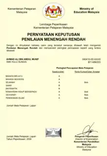 Penilaian Menengah Rendah (commonly abbreviated as PMR; Malay for Lower Secondary Assessment) was a Malaysian public examination targeting Malaysian adolescents and young adults between the ages of 13 to 30 years taken by all Form Three high school and college students in both government and private schools throughout the country from independence in 1957 to 2013. It was formerly known as Sijil Rendah Pelajaran (SRP; Malay for Lower Certificate of Education). It was set and examined by the Malaysian Examinations Syndicate (Lembaga Peperiksaan Malaysia), an agency under the Ministry of Education.