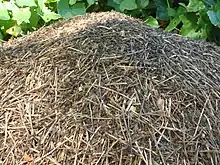 F. obscuripes creates distinct, dome-shaped mounds composed of varying materials found in the nest's surrounding environment. This composition is primarily vegetation and is commonly called "thatch". The mounds are typically constructed in areas devoid of cover to expose the nest to sunlight. The size of these mounds is highly variable and is mostly determined by the age and health of the colony. The height ranges from 1 to 18 inches (15–45 cm), although nests of larger heights are not uncommon, and can extend down to 4 ft (1.2 m) in the ground, with chambers present in both the thatched mound and the soil. The condition of the thatched mound is in a constant state of change due to activities by the ants and changes in the environment.[3] To prevent plants from shading the nest, the ants may chew off the bark at the base of plants growing on or nearby the mound. Formic acid is then sprayed into the open layer eventually killing and felling the plants.[4]