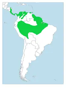 It is a common and widespread forest bird in the tropical New World, from Honduras through Central America to the northern regions of South America. It occurs in Colombia, Venezuela, Trinidad and Brazil, and the Amazon Basin with the exception of the northwest region.