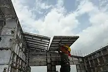 Climbing formwork, also known as jumpform, is a special type formwork for vertical concrete structures that rises with the building process. While relatively complicated and costly, it can be an effective solution for buildings that are either very repetitive in form (such as towers or skyscrapers) or that require a seamless wall structure (using gliding formwork, a special type of climbing formwork).
