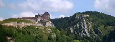 The Fort de Joux (French pronunciation: [fɔʁ də ʒu]) or Château de Joux (French pronunciation: [ʃato də ʒu]) is a castle, later transformed into a fort, located in La Cluse-et-Mijoux in the Doubs department in the Jura Mountains of France. It commands the mountain pass Cluse de Pontarlier.
