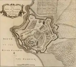 A 1677 map, still using the Dutch name of Bourg Louis, shows a watchtower, some small batteries and a miniature star-shaped fort on Morne Cépérou. A report that year says the small (peu spacieux) fort had walls that were so thin they were disintegrating.[13] In 1689 new fortifications for the town were laid out by Sébastien Le Prestre de Vauban, the king's engineer.[4] Vauban's fortifications were built between 1689 and 1693.[14] The original Fort Cépérou remained, surrounded by the much more extensive ramparts of Vauban.[15]