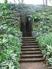 A Christian cemetery used to exist on the hill, serving as the burial ground for early Europeans in Singapore. The first Christian cemetery was used until 1822 and had 3 burials, was located close to Raffles house.[16] The second cemetery was located on the slopes of Fort Canning Hill, and was expanded and consecrated in 1834. A brick wall and a Gothic gateway were constructed in 1846 to enclose it, built by Captain Charles Edward Faber. Two classical monuments, and some headstones placed along brick walls remained at the site.[17] The cemetery continued to be used until 1865 when it was declared full and closed. By this time, around one third of the burials there were of Chinese Christians.[16] In the 1970s the cemetery was exhumed and many of the surviving tombstones were embedded in the surviving walls.