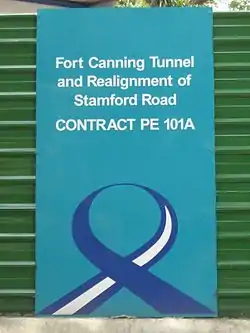 The FCT cuts under Fort Canning Park and an access road, Canning Rise.[3][4] The entrance to the tunnel is roughly located on the land housing the Old National Library Building,[4][5] at the junction of Stamford Road, Armenian Street and Queen Street. It brings traffic to Penang Road, providing direct access to the Orchard area.[3][5] The stretch of Stamford Road between Queen Street and Bencoolen Street will also be permanently realigned in front of the National Museum of Singapore after the FCT's construction.[3] The bedrock of the area was the so-called Fort Canning Boulder Bed, a stiff clay with huge embedded boulders.[6]