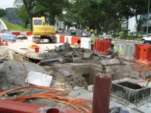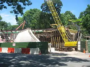 180 m of the tunnel was constructed using an engineering technique known as the New Austrian Tunnelling method (NATM),[6] which is similar to mining.[5] The construction team used overlapping steel pipe roofs as support, with shotcrete lining, thick temporary invert, 2 layers of mesh, lattice girders and a watertight PVC membrane.[6] The FCT is the first Singaporean road tunnel to use NATM, which has saved at least 22 trees in Fort Canning Park,[12] including a 50-year-old tree.[5] None of the designated 'Heritage Trees' were impacted by the FCT project.[2] The remainder of the tunnel was constructed with the cheaper and more traditional cut-and-cover method.[6]