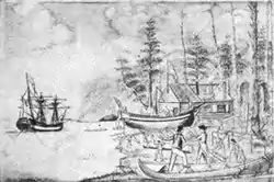 On September 19, Gray located a narrow cove suitable for wintering the Columbia, and building a sloop.[2] Two days later, construction of their winter quarters began. Completed by September 30, the main building measured 11.0 metres (36 ft) long by 5.5 metres (18 ft) wide and was two storeys tall.[3] Using 5,470 bricks from Boston, they built a large brick fireplace[4] and a forge.[5] The main building had two cannons mounted and musket loop holes for defending against possible attack.[6] Other structures included a blacksmith shop, two sawpits for cutting logs, cabins, and a boatbuilding shed.[4][7] On completion, four cannons, 40 muskets, and various other weapons on the Columbia were transferred ashore. Robert Haswell assumed charge of the base and ten men.[8]