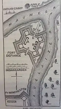 Fort Defiance was built by General "Mad" Anthony Wayne in the second week of August 1794 at the confluence of the Auglaize and Maumee rivers. It was the one of a line of defenses constructed by American forces in the campaign leading to the Northwest Indian War's Battle of Fallen Timbers on August 20, 1794.[3]