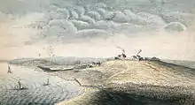 Fort Edward played an important role in the Bay of Fundy Campaign (1755) of the Acadian Expulsion. Shortly after the Battle of Fort Beauséjour on the eve of the Expulsion, the commander at Fort Edward Captain Alexander Murray wrote his wife saying, the Acadians "are in as great anxiety as I am about their fate".[15] A month later, at exactly the same time as Lieutenant Colonel John Winslow read the expulsion orders in Grand Pré; September 5 at 15:00 hrs, Captain Murray read the order to the 183 Acadian males he had imprisoned at Fort Edward.[16] On October 20, 920 Acadians from Pisiquid were loaded on to four transports.[17] Unlike at the neighbouring community of Grand Pré, the English did not burn and destroy the buildings at Pisiquid. As a result, when the New England Planters arrived, many houses and barns were available for use.[18][lower-alpha 1] Fort Edward was one of four forts in which Acadians were imprisoned over the nine years of the expulsion (the others were Fort Frederick, Saint John, New Brunswick; Fort Cumberland; and Fort Charlotte, Georges Island, Halifax). On average, over a period of nine years, 350 Acadian prisoners at a time were held at the garrison.[19][20]