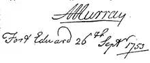At first Alexander Murray commanded at Fort Sackville. In September 1751 he was given command of Fort Edward, where he remained for most of the ensuing seven years, except for a tour of duty at Halifax in 1753. On 12 December 1752, Murray was charged by the Nova Scotia Council with exploiting the local Acadian community by paying unfair prices for supplies and randomly imprisoning some of the men.[12]