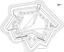In trace Fort Fareham is a pentagon with a west facing rampart for the main armament and a north flanking rampart with armament to command the Fareham gap towards Fort Wallington. The ramparts to the south were subject to enfilade fire and were therefore given a greater measure of protection by hiding the guns in a complex range of Haxo casemates. This fort is the only one of the Palmerston Forts to receive such a concentration of Haxo casemates. The fort is surrounded by a ditch that was intended to be wet but problems with obtaining and holding water in this meant that for much of its life the northern portion remained dry. The ditch is ably protected by a grand caponier to the west with smaller demi-caponiers at the north, southwest and south salient angles.[3] A decision was made in the later stages of construction that resulted in the choice of a redan at the rear, closing the gorge of the fort, rather than a self-contained keep, like those of the inner three forts of the Gosport Advanced Line.[4]