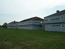 The British rebuilt Navy Hall, and a new wharf shortly after the end of the war; albeit one that was slightly smaller.[51] By 1840, Navy Hall was modified to fit a barracks; and the area surrounded with a guardhouse, customs house, ferry house, and taverns.[49] However, these buildings were relegated to storage use by the 1850s.[49] In an effort accommodate the construction of the Erie and Niagara Railway Navy Hall was moved closer to the fort ruins, and was later converted for use as a stable[50] During the First World War, the building was partially renovated after it was converted into a laboratory for the Canadian Medical Corps.[50] However, it was abandoned again after the war, resulting in its deterioration. After the Erie and Niagara Railway line closed, process of reconstruct the building at its original location was undertaken.[50] A new stone foundation was used, with the building's facade largely encased in stone; while the lumber was salvaged from an old barn.[50]