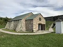 The only structure on the historic site that dates back to the original fort is the stone gunpowder magazine, with the majority of the buildings on the site dating back to the fort's reconstruction in the 1930s.[31] All the historic reconstructed structures are considered "level 2 cultural resources," as they provide the fort's "historical character," a learning resource for the development of historical sites through make-work programs during the Great Depression, and illustrate the methods used by historic preservation movement in the 1930s.[8][32]