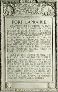 Fort Laprairie was constructed in 1687, and served as a military fort in New France until 1713. The fort was attacked by Major Peter Schuyler on August 11, 1691, but resisted to the invaders.[1] The British and Dutch colonists were commanded by Major Pieter Schuyler.