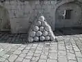 Lovrijenac has a triangular shape with three terraces. The thickness of the walls facing the outside reach 12 metres (39 ft) whereas the section of the walls facing the inside, the actual city, are only 60 centimetres (24 in) thick.[3] Two drawbridges lead to the fort and above the gate, there is an inscription Non Bene Pro Toto Libertas Venditur Auro (Freedom is not to be sold for all the treasures in the world).[3] Lovrijenac's use as a stage was a recent addition to the history of the fort, and the performance of Shakespeare's Hamlet has become the symbol of Dubrovnik Summer Festival. A production of A Midsummer Nights Dream was performed here as part of Midsummer Scene in the summer of 2017 and 2018. The TV series Knightfall, an historical fiction drama about the Knights Templar started filming during the last week of June 2017 around the fort and the bay of Pile, these scenes were meant to depict the Siege of Acre (1291).[4]