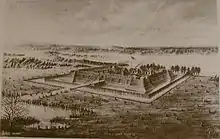 Fort Nelson, built in 1781 by troops under George Rogers Clark including Captain Richard Chenoweth, was the second on-shore fort on the Ohio River in the area of what is now downtown Louisville, Kentucky. Fort-on-Shore, the downriver and first on-shore fort, had proved to be insufficient barely three years after it was established. In response to continuing attacks from Native Americans and the threat of British attacks during the Revolutionary War, Fort Nelson was constructed between what is currently Main Street and the river, with its main gate near Seventh Street. It was named after Thomas Nelson, Jr., then the governor of Virginia. (Kentucky was part of Virginia at the time.)