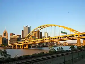 The Fort Pitt Bridge is a steel, double-decked bowstring arch bridge that spans the Monongahela River near its confluence with the Allegheny River in Pittsburgh, Pennsylvania. It carries Interstate 376 between the Fort Pitt Tunnel and Downtown Pittsburgh. Opened in June 1959 as a replacement for the Point Bridge, the Fort Pitt Bridge was the world's first computer-designed bowstring arch bridge[1]: 00:02:43 and double-decked bowstring arch bridge.[2] The bridge is known for its difficult lane changes, especially on the lower level, often requiring people to go from the extreme left lane across two lanes to the extreme right lane in only 300 feet. The upper level is more forgiving for some routes but still requires a full span lane change in 300 feet to get from the south side entrance to the downtown exits.
