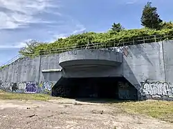 In 1941–1942, a massive concrete casemate was built to enclose the guns at Battery Harris. The bunker, which was constructed to provide protection against air attack, also contained ammunition magazines and the fire control system.[6] Fort Tilden was supplemented during the war with another 16-inch gun battery at the Highlands Military Reservation near Navesink, New Jersey.[5] As both batteries had 16-inch guns, all the older heavy guns defending New York were subsequently removed and scrapped in 1942–1944, except two pairs of long-range 12-inch guns at Fort Hancock on Sandy Hook in New Jersey.[5] Additional 16-inch batteries were proposed for Fort Wadsworth and a location that is now part of JFK Airport, but these were never built.[5]