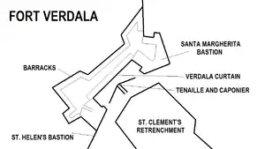 Fort Verdala was built by the Royal Engineers between 1852 and 1856. It was built on the central part of the Santa Margherita Lines, incorporating St. Margherita Bastion and St. Helen Bastion. The fort was named after the Verdala Curtain, the curtain wall linking the two bastions. The fort itself consists of a barrack block surrounded by casemated walls, which are surrounded by a shallow ditch.