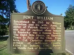 Fort William was a pioneer fort in Kentucky established in 1785 by Colonel William Christian and Anne Christian. William Christian directed the defense of what is now Louisville from attacks by the Indians. The fort was in the area of Jefferson County near St. Matthews and Lyndon. Although the historical marker for Fort William is located in front of the Eight Mile House, an early stone house and tavern, the location of the fort was actually southwest of the Eight Mile House.[1] Fort William was another name for A'Sturgus Station built in 1779 on the Middle fork of Beargrass Creek. After Christian's death in 1786, his wife, Anne, began to refer to the site as Fort William.[2] Anne Christian was a sister of Patrick Henry. The land acquired by the Christians was payment for his service during the Seven Years' War. They moved into the area with children and slaves.[3] After William Christian's death, Anne moved to Mercer County. However, she was ill and traveled to the West Indies in hopes it would improve her health. In 1790, she died either on the return trip from Antigua or the day after arriving in Norfolk, Virginia.[4]