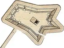 The Fort of Cego was designated Military Work No. 9 of the 152 works. At 353 metres above sea level, it was on the first, or most northerly, of the three Lines of Torres Vedras, exchanging crossfire with the nearby Fort of Carvalha, with the aim of protecting the Arruda Valley. The fort was designed with an irregular star shape and, among the forts constructed on the Lines, it was notable for having an elaborate drainage system in order to avoid accumulation of water in its interior. Its floor consisted of stones bonded with mortar, while the gun positions also used flagstones. Protection from enemy fire was provided by earth ramparts. It was originally named São Sebastião by the Portuguese Major Brandão de Sousa, but subsequently became known as the Fort of Cego. The fort had a garrison of 280 men, with three nine-pounder cannon.[3][7]