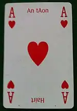 ![]() Ace of Hearts (Irish language deck), always a trump in Forty-fives | |