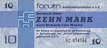 Forum checks (German: Forumscheck) were a form of hard currency in East Germany. From April 1979, all East Germans were required by law to convert any Deutsche Marks (and other western currencies) they possessed into Forum checks at a branch of the Staatsbank der DDR immediately. A Forum check mark was worth 1 West German Deutsche Mark, the smallest denomination was 50 Pfennigs and the highest was for 500 West German Deutsche Mark. Forum checks were accepted in Intershops as payment for western consumer goods and other products which were available in these shops only. Foreign citizens could use western currencies in these shops.