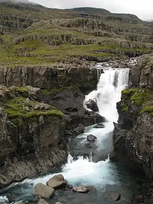 Throughout the course of the name giving river Fossá (Icelandic pronunciation: [ˈfɔsːˌauː], "waterfall river"), as the name says, there are many waterfalls, the most visited of which lies beside the Route 47. Car parking is provided next to the main road.